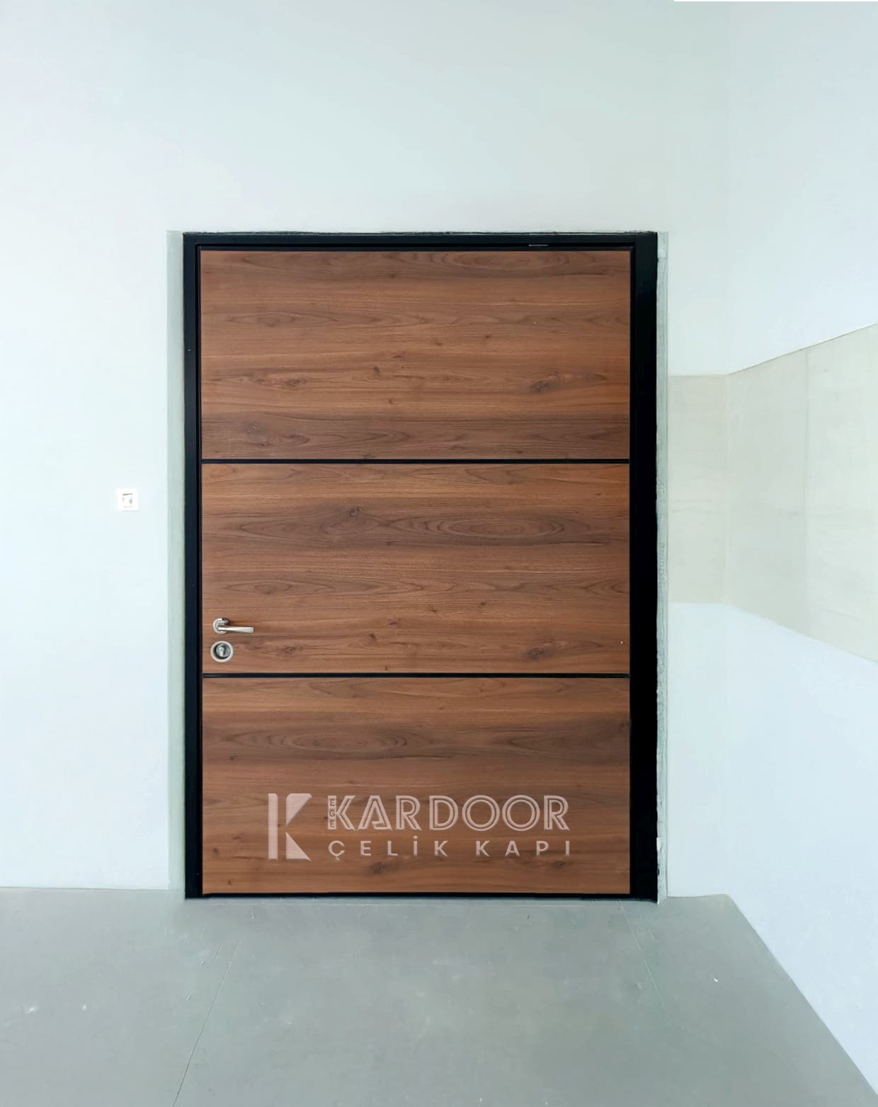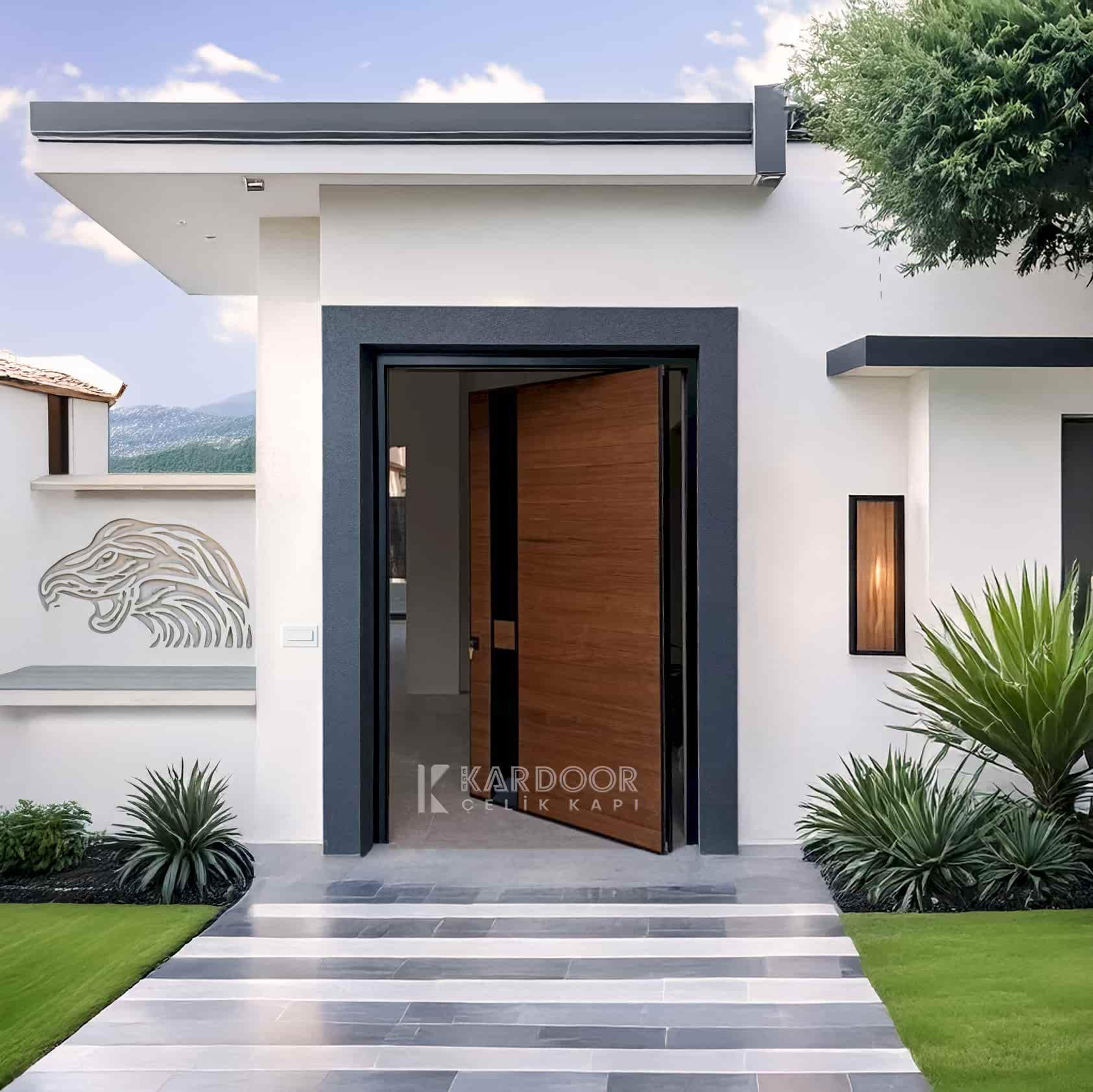 Alüminyum Pivot Kapı – Thermowood Limba – Özel Tasarım Kol
